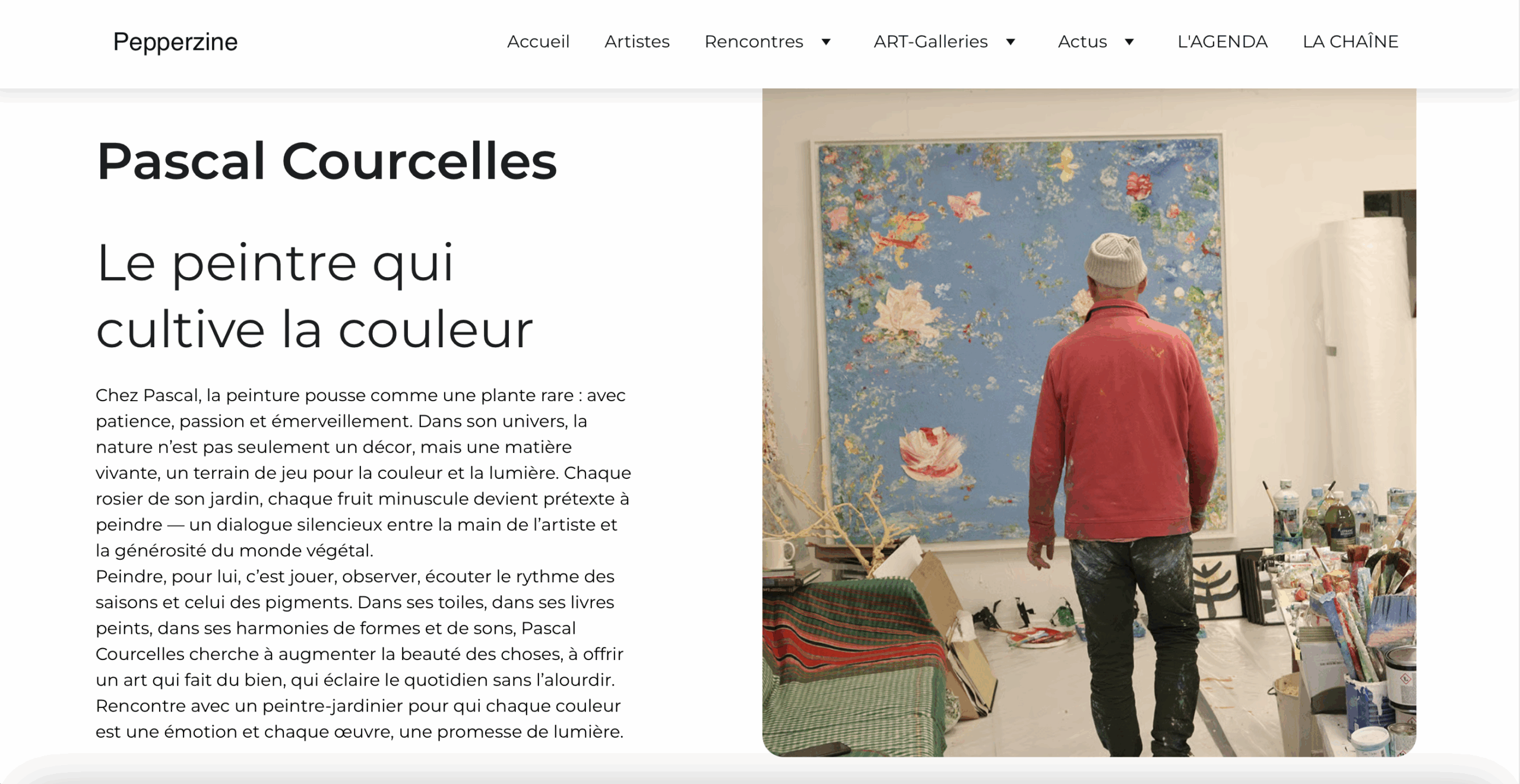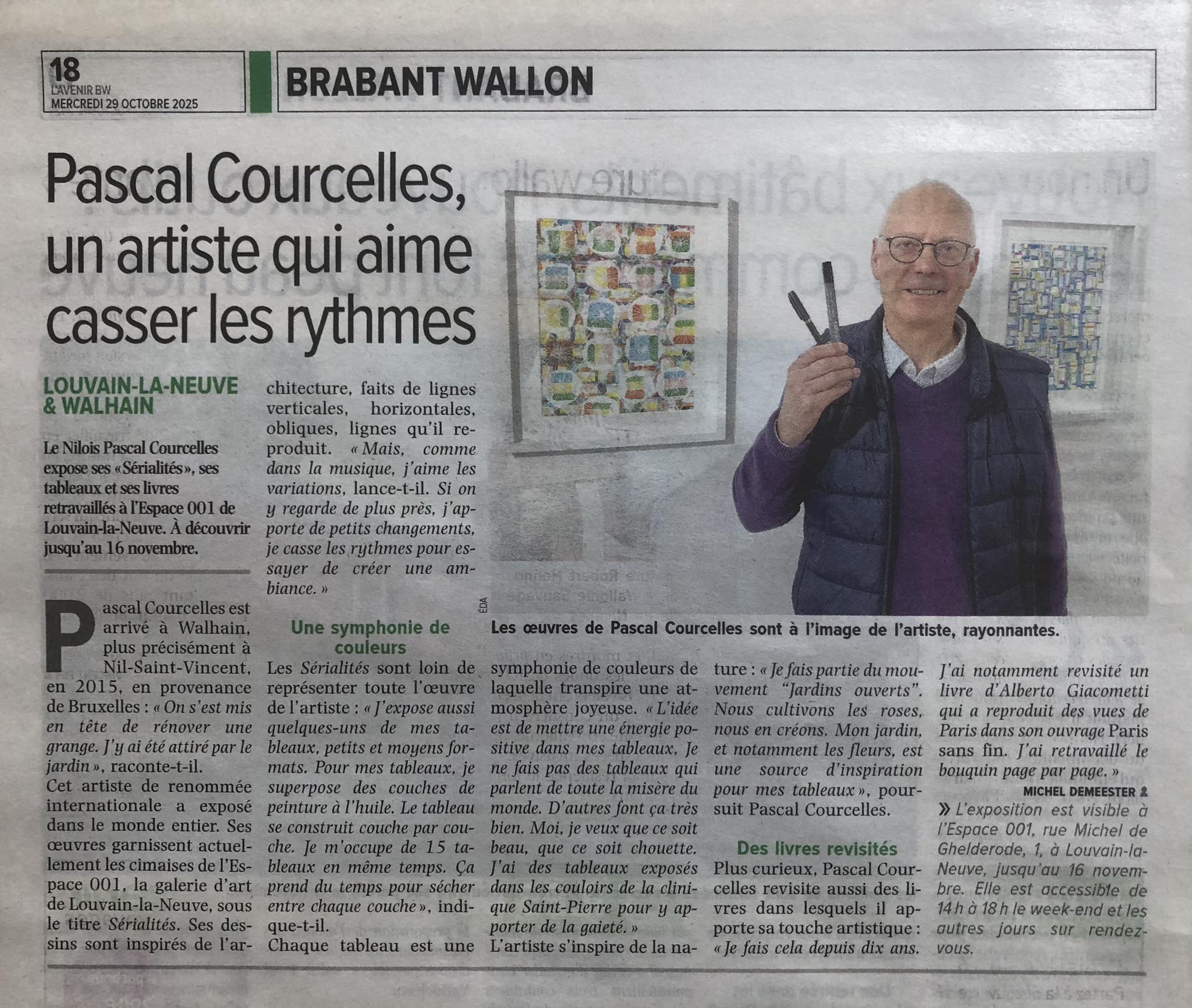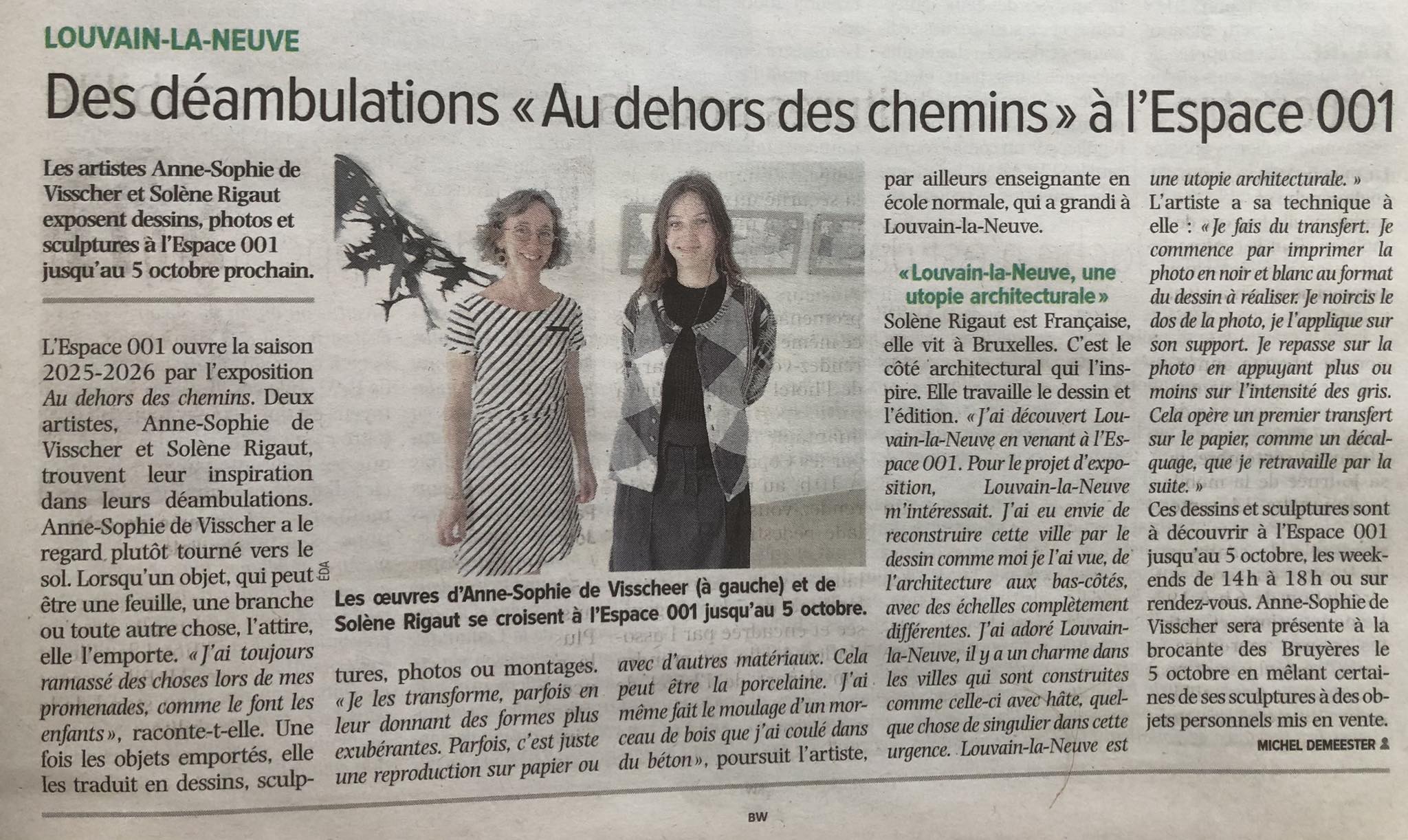 Archives presse Pepperzine -rencontre avec Pascal Courcelles/ Espace 001 | octobre 2025 L’avenir – Pascal Courcelles/ Espace 001 | 29/10/2025 L’avenir.net – Au dehors les chemins/ Espace 001 | 12/09/2025 TV COM – Pascal Courcelles/ Espace 001 | 03/11/2025 L’avenir.net – Isabelle Nouwynck/ Espace 001 | 02/06/2025 Pepperzine – / Espace 001 |juin 2025 L’avenir.net – Cécilia Shishan/ Espace 001 | 05/02/2025 L’avenir.net – Sandra Velarde/ Espace 001 | 10/03/2025 L’eventail – Cécilia Shishan/ Espace 001 | 01/02/2025 L’avenir.net – Small to(o) small/ Espace 001 | 15/12/2024 L’Eventail– Justine Englebert/ Espace 001 | 01/10/2022 L’avenir.net – nouveaux locaux pour espace 001/ Espace 001 | 09/2022 L’Eventail -Cécile Ahn / Espace 001 | 10/08/2022 L’avenir.net -Nathalie Dandoy / Espace 001 | 16/06/2022 dhnet.be – Virginie de Limbourg/ Espace 001 | 09/03/2022 L’avenir.net – Vincent Delpierre/ Espace 001 | 19/11/2021 L’avenir.net – Féminin/sacré #2 / Espace 001 13/03/2021 TV COM – Pause Culture (minute 11’10) / Espace 001 02/12/2020 L’avenir.net – Féminin-sacré #1 / Espace 001 26/10/2020 L’avenir.net – Laurence Demaret / Espace 001 18/09/2020 L’avenir.net – Un duo en bivouac / Espace 001 13/03/2020