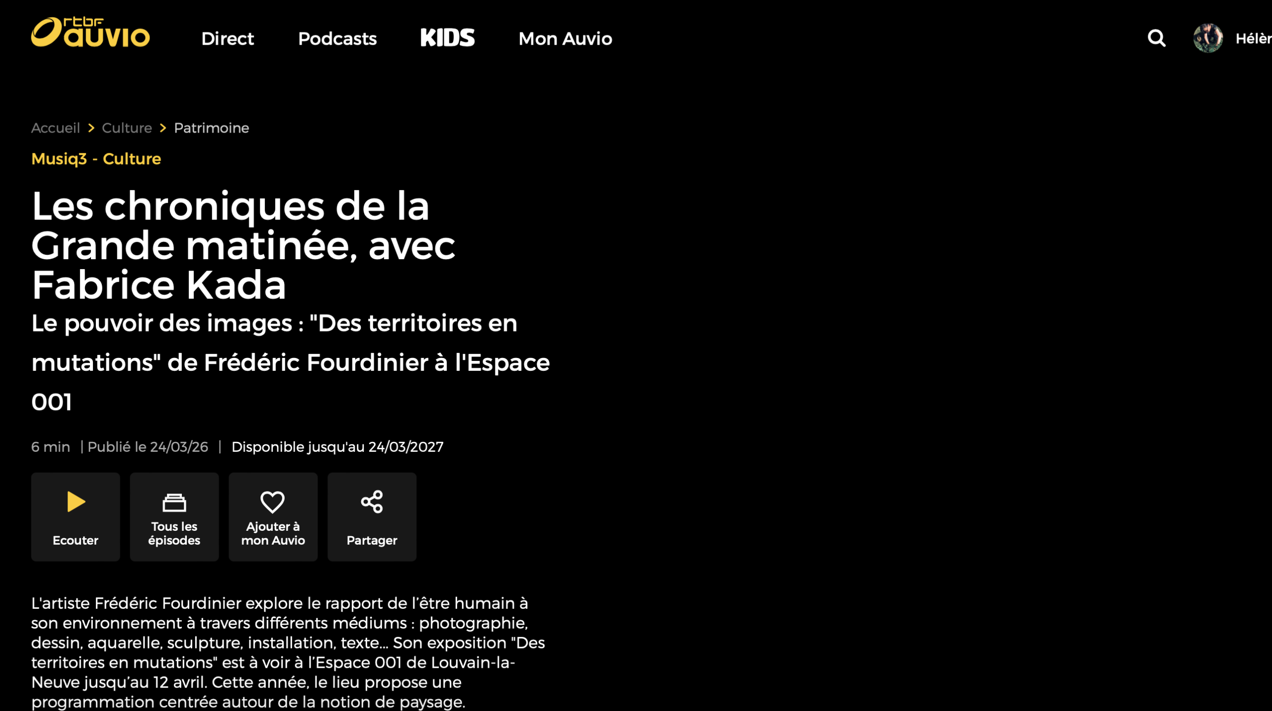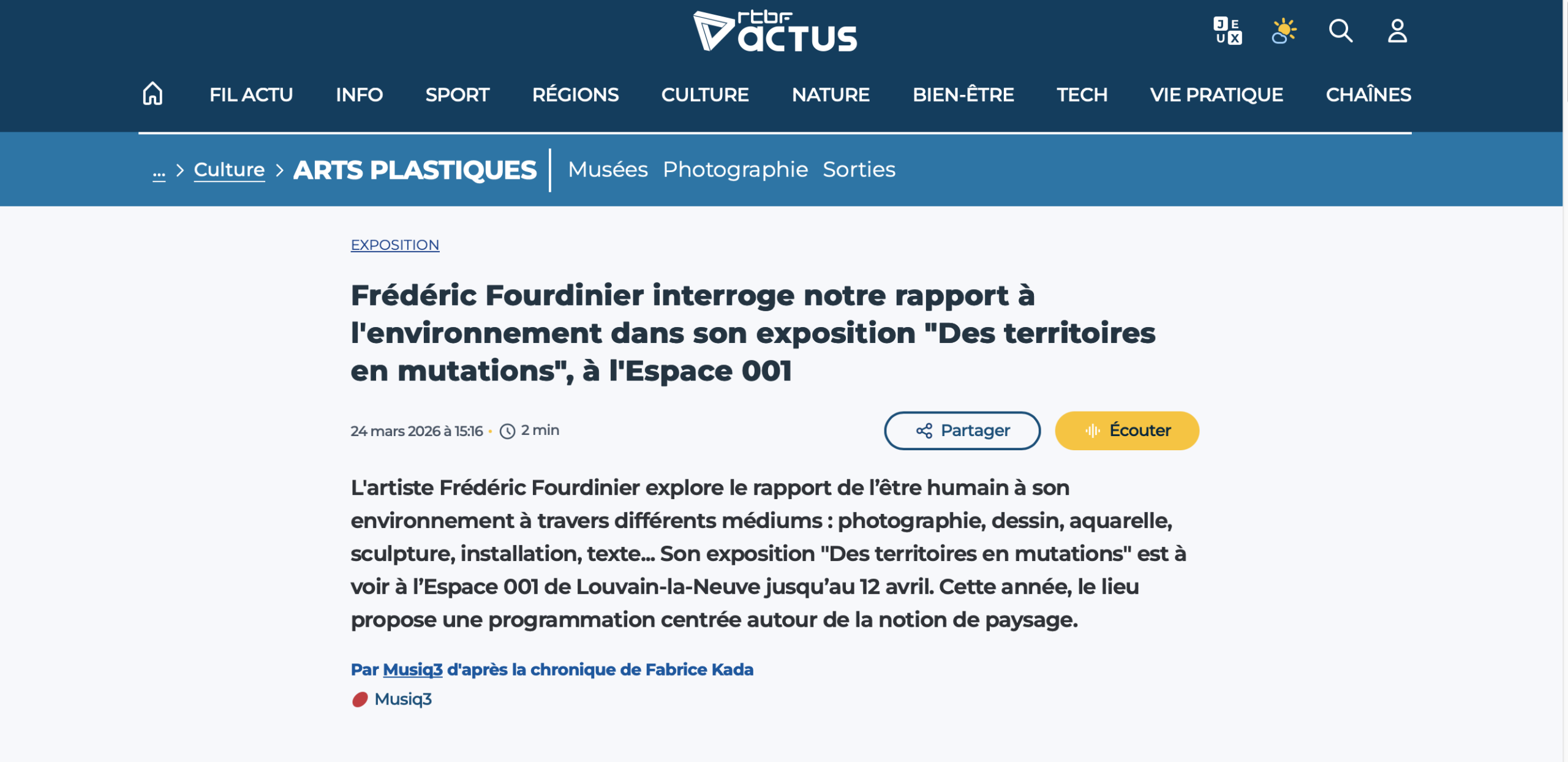 Archives presse Musique 3 – Frédéric Fourdinier/ Espace 001 | 24/03/2026 RTBF – Frédéric Fourdinier/ Espace 001 | 24/03/2026 La Libre -Frédéric Fourdinier/ Espace 001 | 1/04/ 2026 L’avenir – Pascal Courcelles/ Espace 001 | 29/10/2025 Pepperzine -rencontre avec Pascal Courcelles/ Espace 001 | octobre 2025 L’avenir – Pascal Courcelles/ Espace 001 | 29/10/2025 L’avenir.net – Au dehors les chemins/ Espace 001 | 12/09/2025 TV COM – Pascal Courcelles/ Espace 001 | 03/11/2025 L’avenir.net – Isabelle Nouwynck/ Espace 001 | 02/06/2025 Pepperzine – / Espace 001 |juin 2025 L’avenir.net – Cécilia Shishan/ Espace 001 | 05/02/2025 L’avenir.net – Sandra Velarde/ Espace 001 | 10/03/2025 L’eventail – Cécilia Shishan/ Espace 001 | 01/02/2025 L’avenir.net – Small to(o) small/ Espace 001 | 15/12/2024 L’Eventail– Justine Englebert/ Espace 001 | 01/10/2022 L’avenir.net – nouveaux locaux pour espace 001/ Espace 001 | 09/2022 L’Eventail -Cécile Ahn / Espace 001 | 10/08/2022 L’avenir.net -Nathalie Dandoy / Espace 001 | 16/06/2022 dhnet.be – Virginie de Limbourg/ Espace 001 | 09/03/2022 L’avenir.net – Vincent Delpierre/ Espace 001 | 19/11/2021 L’avenir.net – Féminin/sacré #2 / Espace 001 13/03/2021 TV COM – Pause Culture (minute 11’10) / Espace 001 02/12/2020 L’avenir.net – Féminin-sacré #1 / Espace 001 26/10/2020 L’avenir.net – Laurence Demaret / Espace 001 18/09/2020 L’avenir.net – Un duo en bivouac / Espace 001 13/03/2020